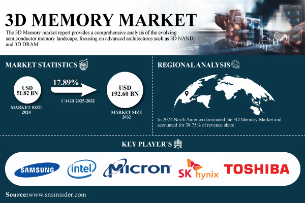 According to the SNS Insider,“The 3D Memory Market Size was valued at USD 51.82 Billion in 2024 and is projected to reach USD 192.60 Billion by 2032, growing at a CAGR of 17.89% during 2025-2032.”