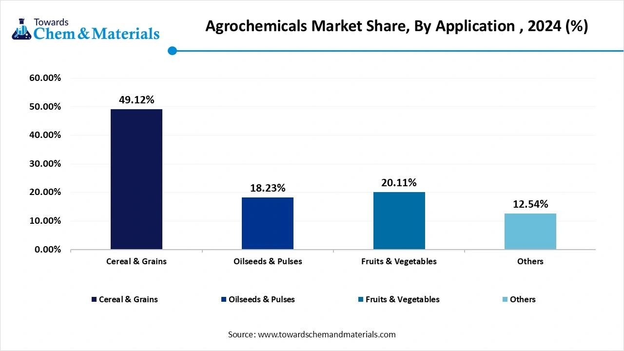 - By application, the cereal & grains segment led the agrochemicals market share of 49.12% in 2024 due to the growing consumption of maize, wheat, and rice.