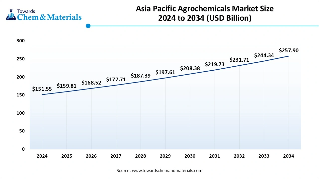 The Asia Pacific agrochemicals market is expected to increase from USD 159.81 billion in 2025 to USD 257.90 billion by 2034, growing at a CAGR of 5.46% throughout the forecast period from 2025 to 2034.