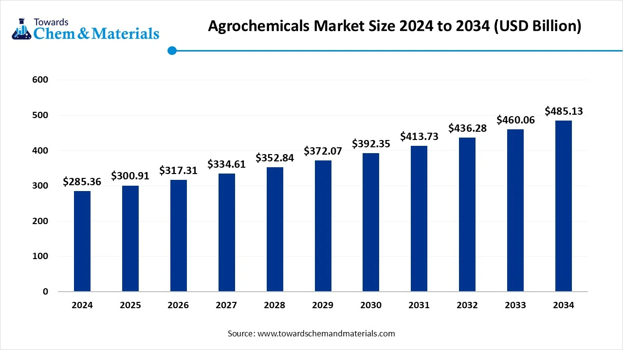 According to Towards Chemical and Materials, the global agrochemicals market size is calculated at USD 300.91 billion in 2025 and is expected to be worth around USD 485.13 billion by 2034, growing at a CAGR of 5.45% from 2025 to 2034.