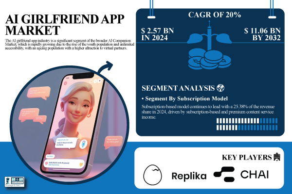 Austin, Nov. 20, 2025 (GLOBE NEWSWIRE) — The AI Girlfriend App Market size was worth USD 2.57 billion in 2024 and is expected to reach USD 11.06 billion by 2032, expanding at a CAGR of 20% over the forecast period (2025-2032).