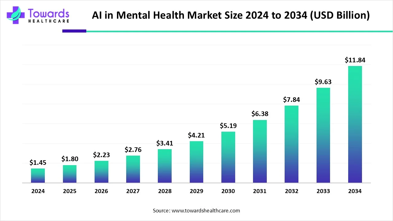 According to Towards Healthcare, the global AI in mental health market size is calculated at USD 1.80 billion in 2025 and is expected to reach around USD 11.84 billion by 2034, growing at a CAGR of 24.15% for the forecasted period.