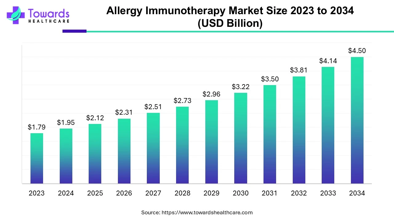 The global allergy immunotherapy market size is calculated at USD 2.12 billion in 2025 and is expected to reach around USD 4.50 billion by 2034, growing at a CAGR of 8.73% for the forecasted period.