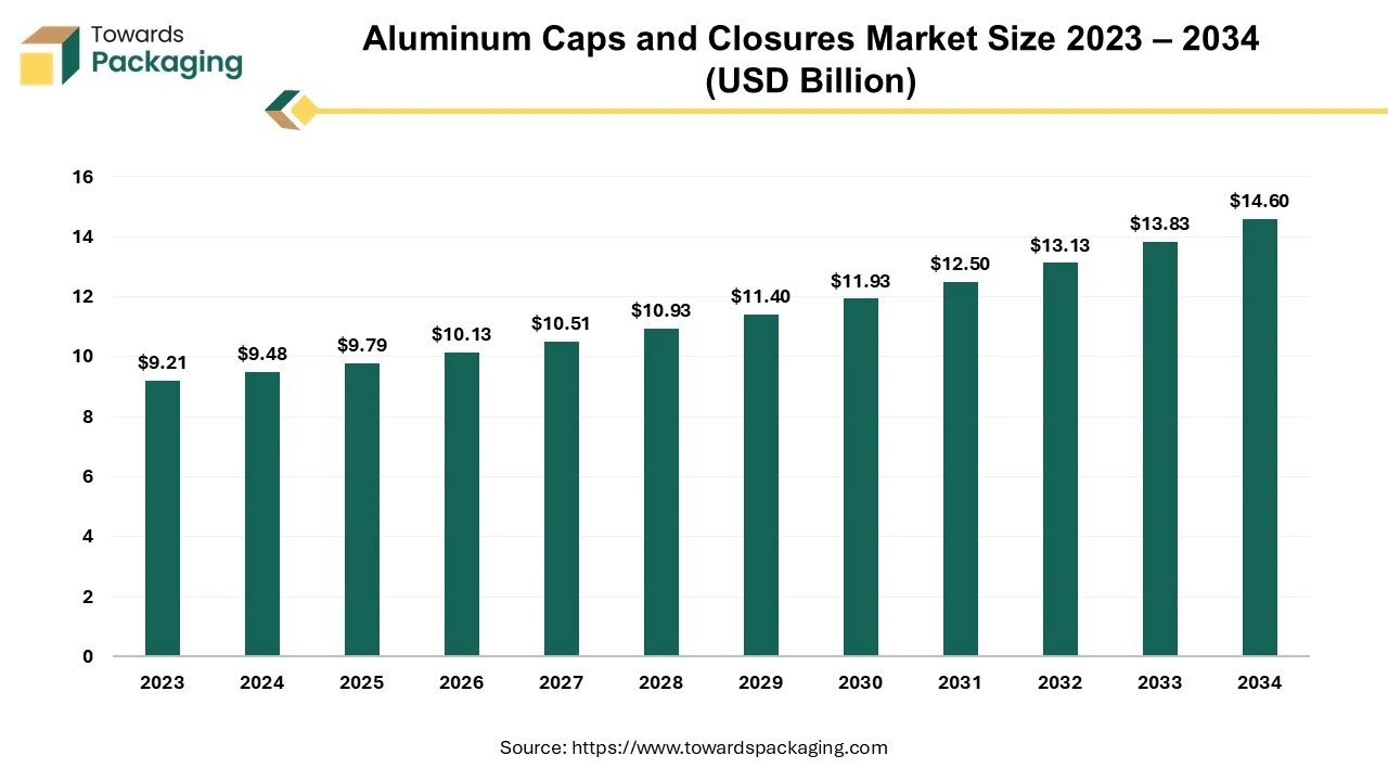 According to Towards Packaging consultants, the global aluminum caps and closures market is projected to reach approximately USD 14.60 billion by 2034, increasing from USD 9.79 billion in 2025, at a CAGR of 4.28% during the forecast period 2025 to 2034.