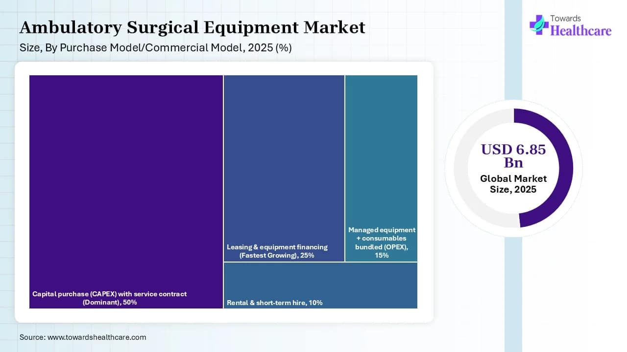 - By purchase model/commercial model, the capital purchase (CAPEX) with the service contract segment dominated the ambulatory surgical equipment market share by 50% in 2025.