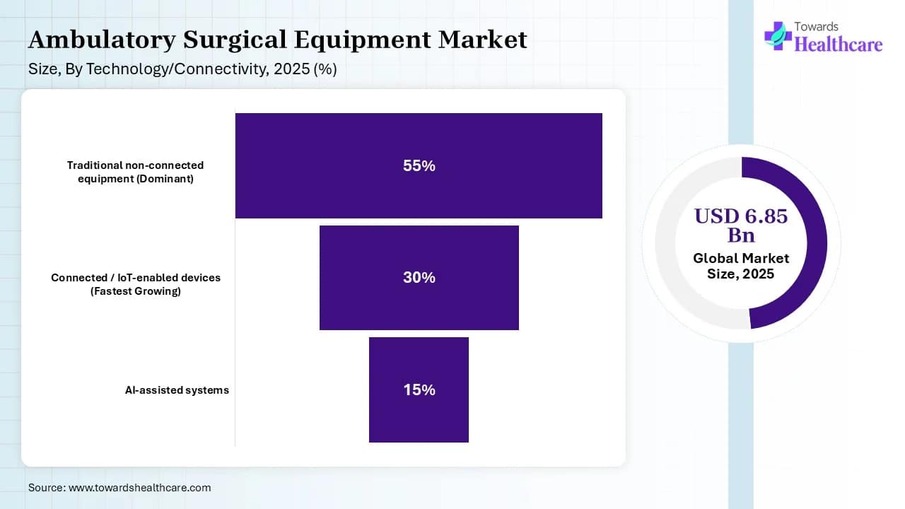 The traditional non-connected equipment segment led the market share by 55% in 2025, owing to operational simplicity, reliability, faster turnover, and clinical efficacy in routine procedures. They reduce the risk of software glitches or network downtime that can delay a surgery. They are advancing due to the growing trend of digital connectivity. The traditional equipment is the primary choice for specific workflows that require security, simplicity, and durability.
