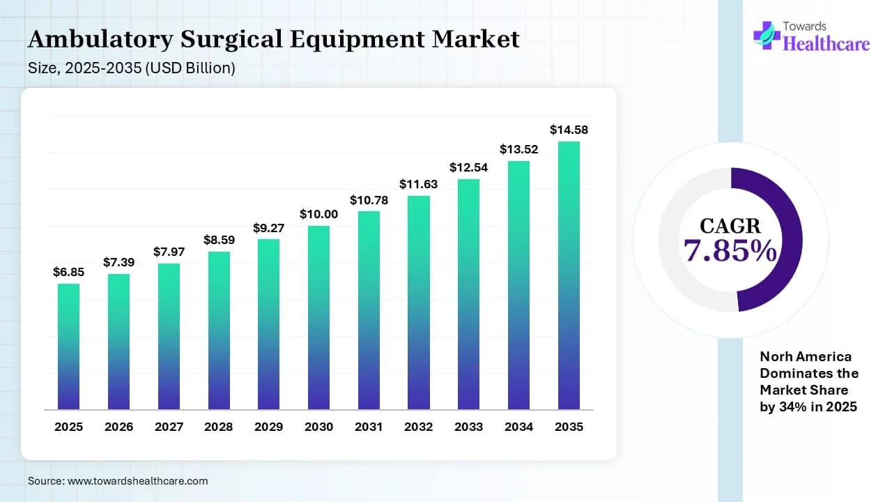 The global ambulatory surgical equipment market size was valued at USD 6.85 billion in 2025 and is predicted to hit around USD 14.58 billion by 2035, rising at a 7.85% CAGR, a study published by Towards Healthcare a sister firm of Precedence Research.