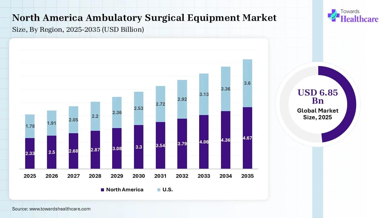 The ambulatory surgical equipment market in the U.S. held 26% share in 2025 reaching USD 1.78 billion in 2025, is being accelerated by a rapid shift of complex procedures from hospitals to outpatient settings, and technological breakthroughs like AI-integrated robotics. The surging investments and revenues are resulting in the expansion of ambulatory surgical centers, driven by improved recovery drugs, advances in minimally invasive surgery, and policies promoting site-neutral payments.