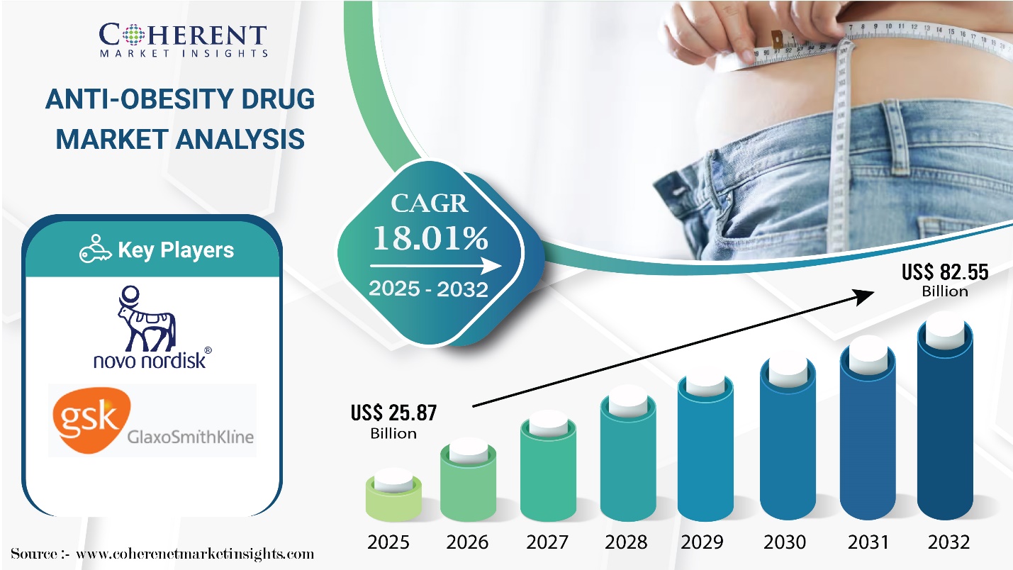 Burlingame, CA, Nov. 20, 2025 (GLOBE NEWSWIRE) — The Global Anti-Obesity Drug Market is estimated to be valued at USD 25.87 Bn in 2025 and is expected to reach USD 82.55 Bn by 2032, exhibiting a compound annual growth rate (CAGR) of 18.01% from 2025 to 2032. The market’s strong expansion is driven by the growing worldwide incidence of obesity and the increasing need for effective pharmaceutical treatments. Continued innovation in drug formulations, along with the development of healthcare infrastructure across emerging economies, further supports sustained market growth throughout the forecast period.