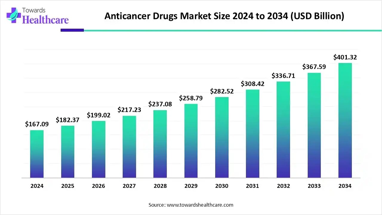 Ottawa, Nov. 21, 2025 (GLOBE NEWSWIRE) — The global anticancer drugs market size was valued at USD 167.09 billion in 2024 and is predicted to hit around USD 401.32 billion by 2034, rising at a 9.14% CAGR, a study published by Towards Healthcare a sister firm of Precedence Research.