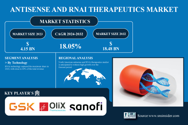According to SNS Insider, the global Antisense and RNAi Therapeutics Market was valued at USD 4.15 billion in 2023 and is expected to reach USD 18.48 billion by 2032, registering a compound annual growth rate (CAGR) of 18.05%. This growth is largely driven by the increasing prevalence of genetic disorders, chronic diseases and cancer, as well as advances in RNA-based drug development and government support for Precision Medicine.