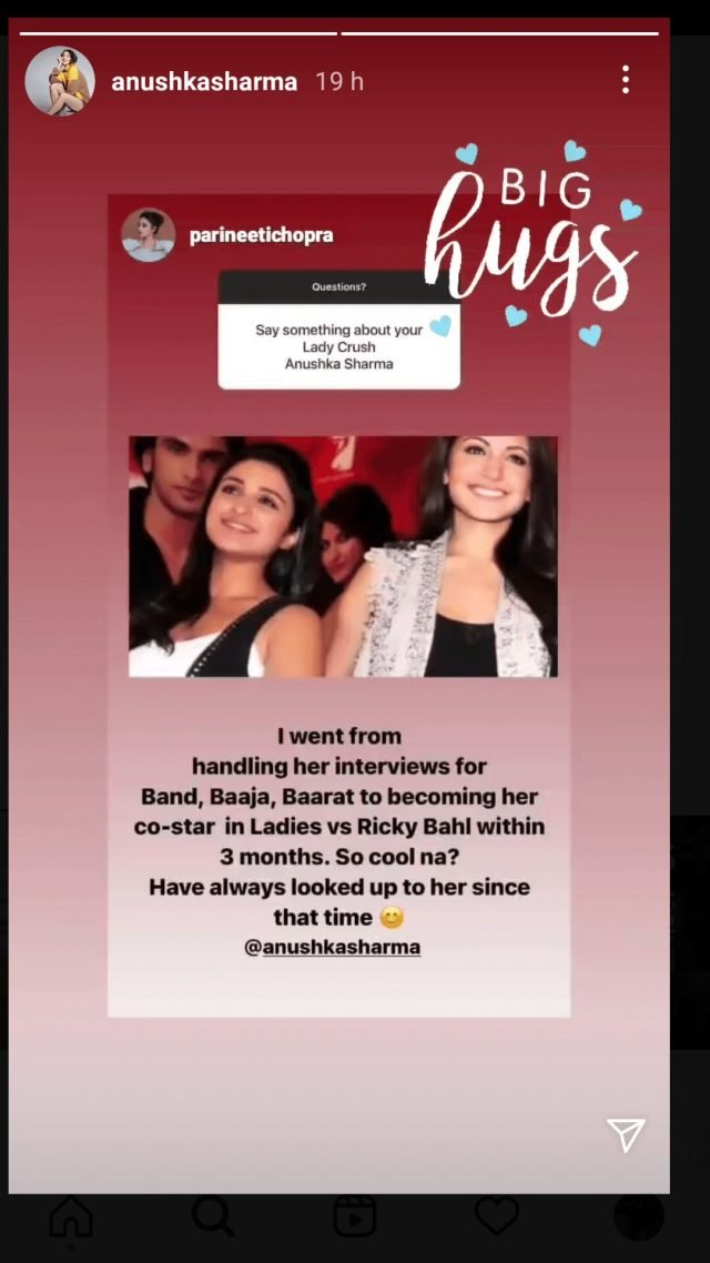 In Parineeti’s recent ‘Ask Me Anything’ session on Instagram, a fan asked her to say something about her ‘lady crush’ Anushka Sharma. to which Parineeti replied, “I went from handling her interviews for ‘Band, Baaja, Baaraat’ to becoming her co-star in ‘Ladies vs Ricky Bahl’ within 3 months. So cool na? Have always looked up to her since that time.” This story evoked a sweet gesture from Anushka as well, she reposted Parineeti’s story and sent her ‘Big hugs.’