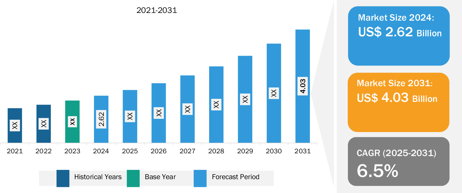 1. Market Growth: The aortic stent graft market value is expected to reach US$ 4.03 billion by 2031 from US$ 2.62 billion in 2024; the market is anticipated to register a CAGR of 6.5% during 2025–2031. The market growth is attributed to the rising prevalence of aortic aneurysms, the shift toward minimally invasive procedures, and increased healthcare infrastructure spending in emerging markets.