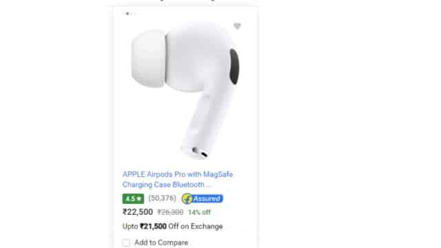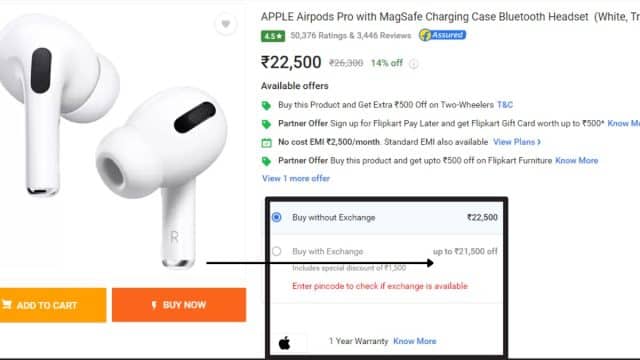 After a Rs 3,800 discount, the Apple AirPods Pro are currently available on Flipkart for Rs 22,500. Flipkart, in contrast to other e-commerce sites, enables you to trade in your old smartphone in exchange for discounts on the majority of electronic products, not just smartphones. This means that Flipkart will discount your purchase by an additional Rs 21,500 if you are exchanging an old smartphone. Apple AirPods Pro are available from Flipkart for just Rs 1,000 after all promotions and discounts.