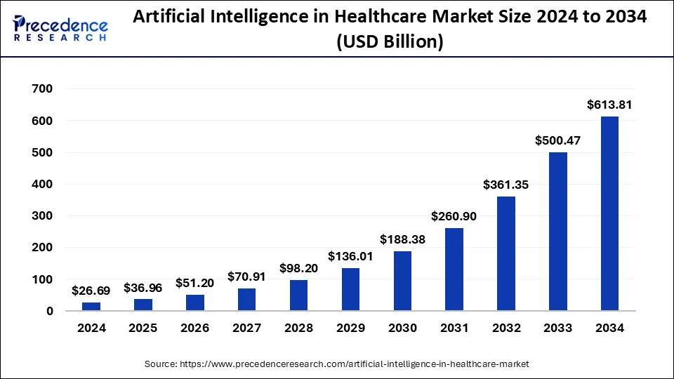 AI in Healthcare Market: The market size was valued at USD 26.69 billion in 2024 and is projected to reach USD 613.81 billion by 2034, with a CAGR of 36.83% from 2024 to 2034.