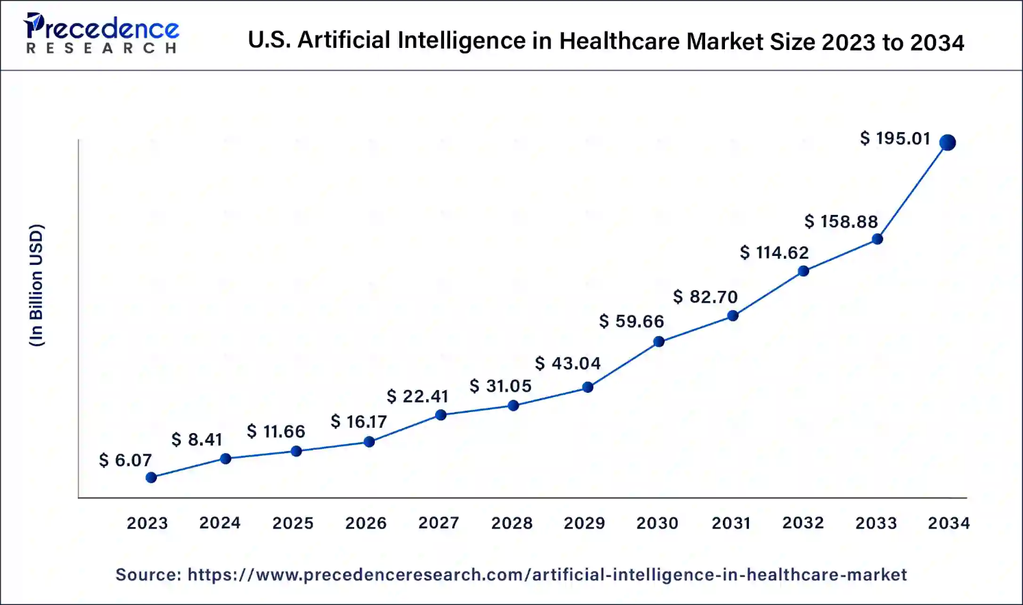 The U.S. artificial intelligence (AI) in healthcare market size reached USD 8.41 billion in 2024 and is projected to surpass over USD 195.01 billion by 2034, growing at a healthy CAGR of 37% from 2024 to 2034.