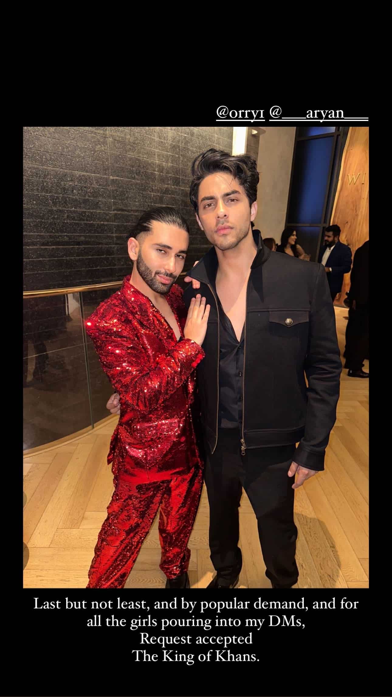 Aryan wore an all-black look for the event, looking dashing in a black shirt layered over a black zipper jacket and matching pants. In the meantime, another photo of Aryan Khan has emerged on social media, showing him standing with Orhan Awatramani at the party.