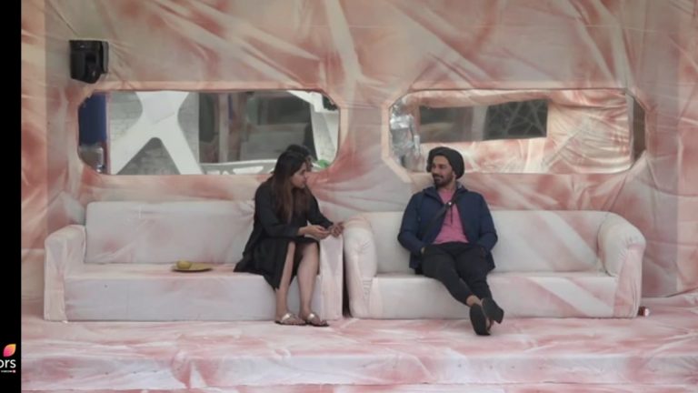 Nikki Tamboli and Abhinav Sukhla taking about a funny incident that about between her and Devoleena Bhattacharjee in the morning.