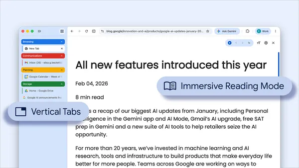 Google Chrome introduces vertical tabs and immersive reading mode to enhance user productivity and streamline browsing.
