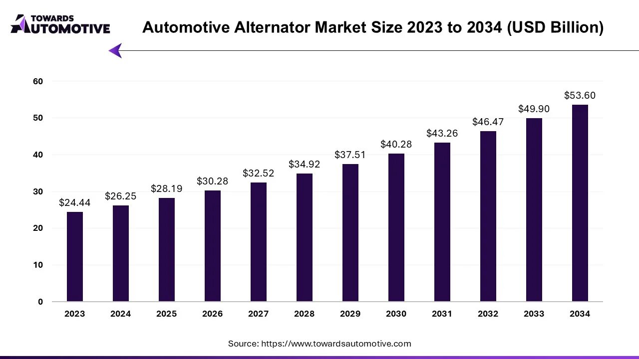 As detailed in the latest report by Towards Automotive, the global automotive alternator market is forecast to grow from USD 30.28 billion in 2026 to about USD 53.60 billion by 2034, at a CAGR of 7.40% between 2025 and 2034.