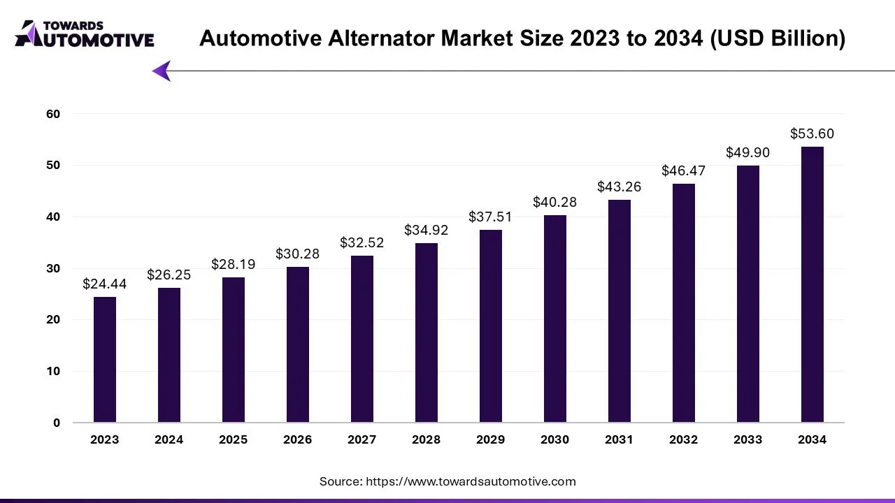 Ottawa, Oct. 06, 2025 (GLOBE NEWSWIRE) — The global automotive alternator market was assessed at USD 28.19 billion in 2025, with projections indicating an increase to USD 53.60 billion by 2034, based on insights from Towards Automotive, a sister firm of Precedence Research.