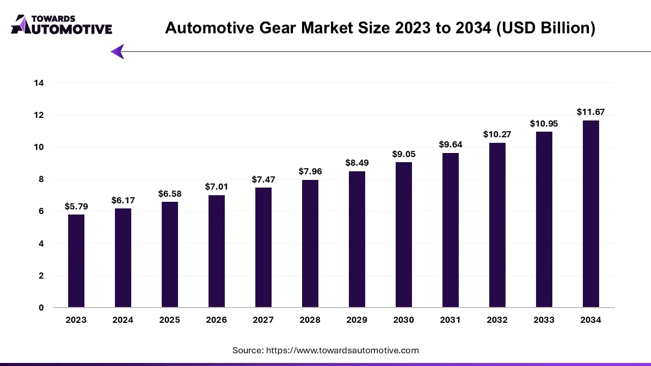 According to Towards Automotive Experts, the global automotive gear market size is calculated at USD 6.58 billion in 2025 and is expected to reach around USD 11.67 billion by 2034, growing at a CAGR of 6.58% from 2024 to 2034.