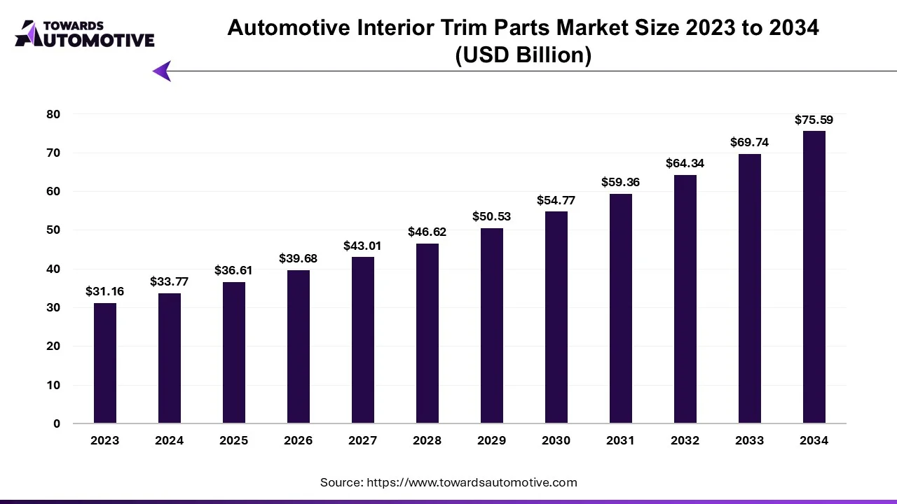 According to Towards Automotive consultants, the global automotive interior trim parts market is projected to reach approximately USD 75.59 billion by 2034, increasing from USD 33.77 billion in 2024, at a CAGR of 8.39% during the forecast period 2025 to 2034.
