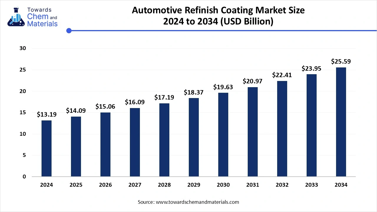 According to Towards chem and Materials Consultants, the global automotive refinish coating market size is calculated at USD 14.09 billion in 2025 and is expected to reach around USD 25.59 billion by 2034, growing at a CAGR of 6.85 % for the forecasted period.