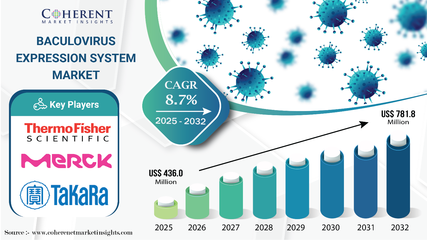 According to Coherent Market Insights (CMI), the global baculovirus expression system market size is expected to reach USD 781.8 Mn by 2032, up from USD 436 Mn in 2025, registering a CAGR of 8.7%.