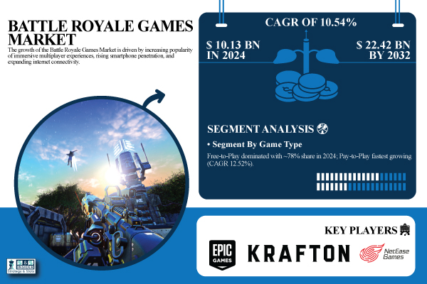 Austin, Oct. 07, 2025 (GLOBE NEWSWIRE) — The Battle Royale Games Market was valued at USD 10.13 billion in 2024 and is expected to reach USD 22.42 billion by 2032, growing at a CAGR of 10.54% during 2025-2032.