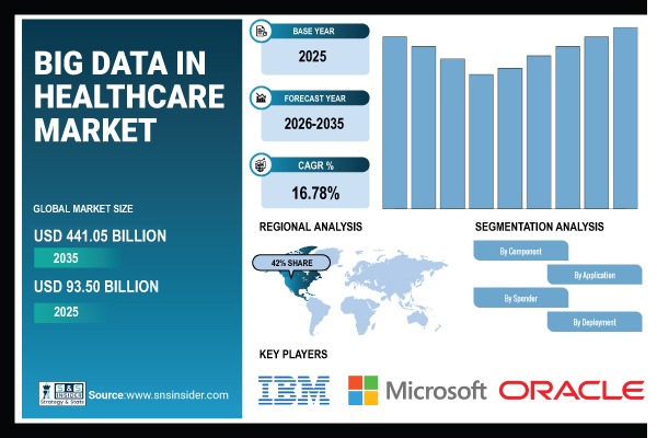 Austin, April 28, 2026 (GLOBE NEWSWIRE) — According to SNS Insider, The Big Data in Healthcare Market size was valued at USD 93.50 Billion in 2025 and is projected to reach USD 441.05 Billion by 2035, growing at a CAGR of 16.78% during 2026–2035.