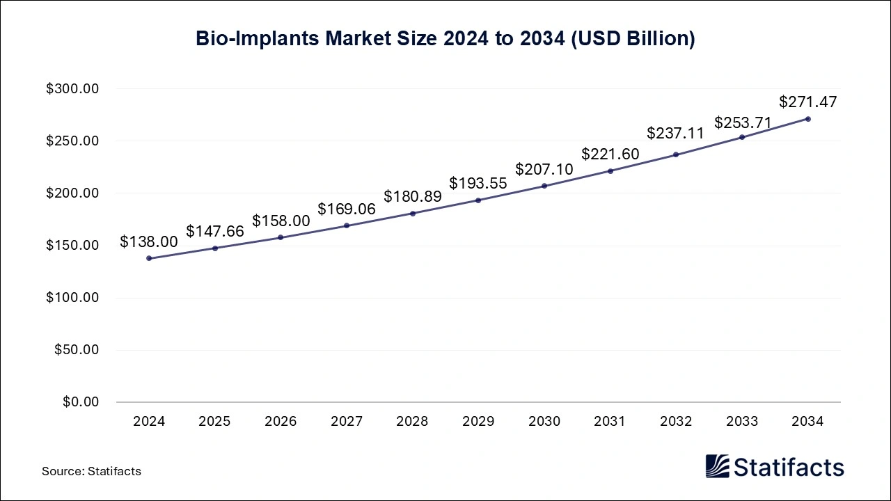 The global Bio-implants market size was estimated at USD 138 billion in 2024 and is anticipated to reach around USD 271.47 billion by 2034, growing at a CAGR of 7% from 2024 to 2034. A study published by Statifacts a sister firm of Precedence Research.