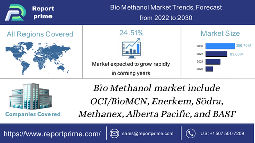 The Bio Methanol Market is expected to grow from USD 83.00 Million in 2022 to USD 386.70 Million by 2030, at a CAGR of 24.51% during the forecast period. | Source:PRIMEIQ RESEARCH (OPC) PRIVATE LIMITED