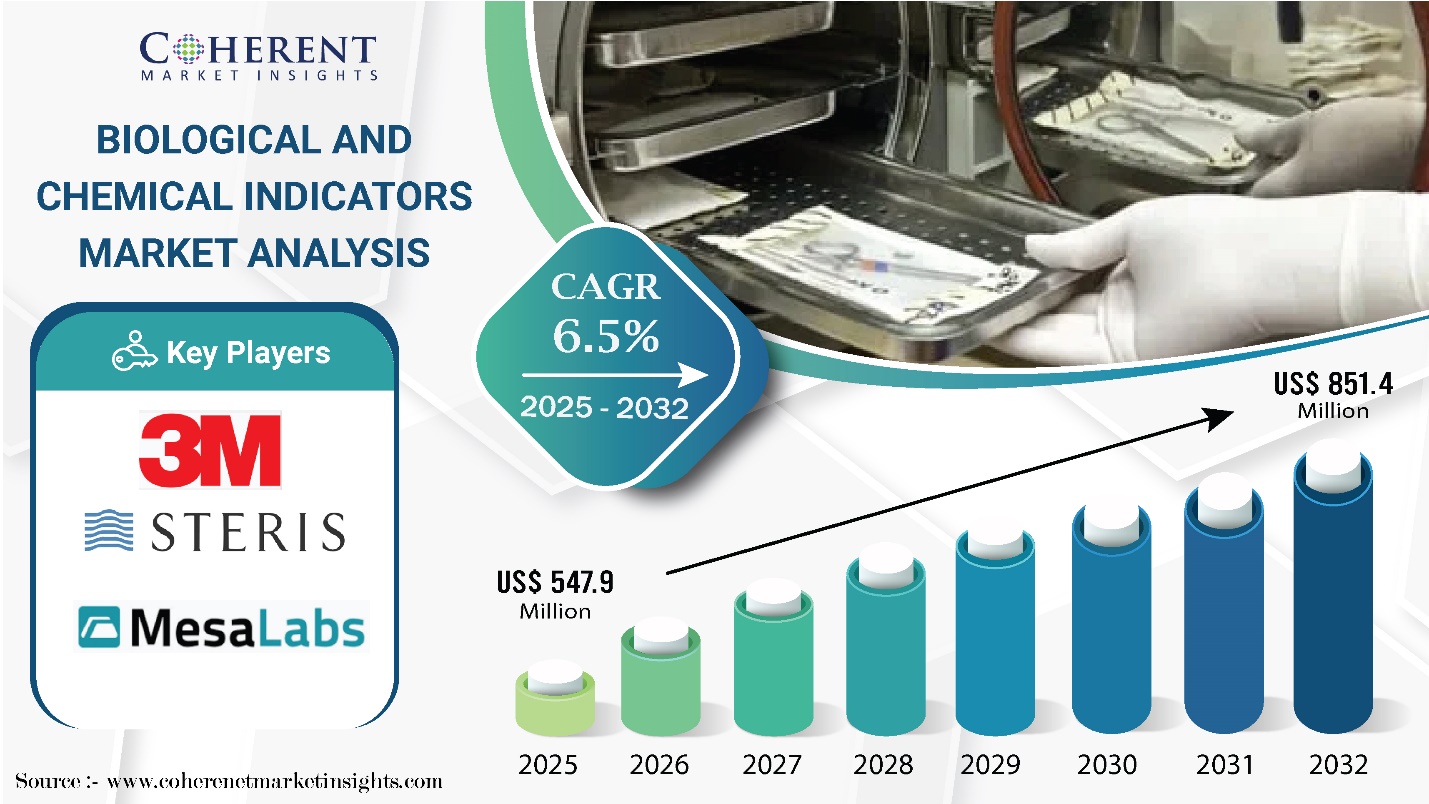 Burlingame, CA, Nov. 11, 2025 (GLOBE NEWSWIRE) — The Global Biological and Chemical Indicators Market is estimated to be valued at USD 547.9 Mn in 2025 and is expected to reach USD 851.4 Mn by 2032, exhibiting a compound annual growth rate (CAGR) of 6.5% from 2025 to 2032. This consistent growth is propelled by growing awareness of sterilization validation processes and the enforcement of strict regulatory standards across the healthcare and pharmaceutical sectors, driving the need for reliable and effective quality assurance indicators.