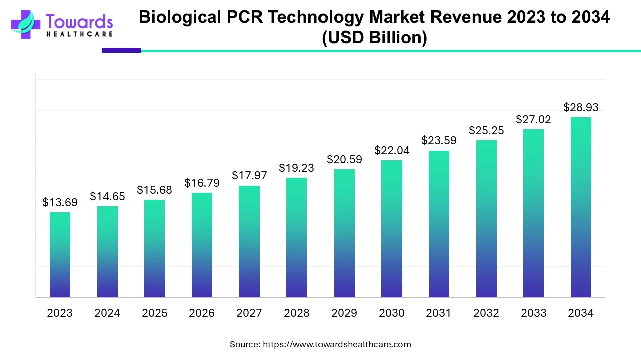 Ottawa, April 15, 2025 (GLOBE NEWSWIRE) — According to Towards Healthcare research, the global biological PCR technology market size was valued at USD 14.65 billion in 2024 and is predicted to hit around USD 28.93 billion by 2034, a study published by Towards Healthcare a sister firm of Precedence Research.
