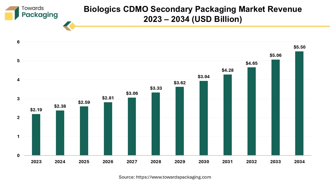 Ottawa, April 08, 2025 (GLOBE NEWSWIRE) — The biologics CDMO secondary packaging market size to record US$ 2.59 billion in 2025 and is projected to grow beyond US$ 5.50 billion by 2034, a study published by Towards Packaging a sister firm of Precedence Statistics.
