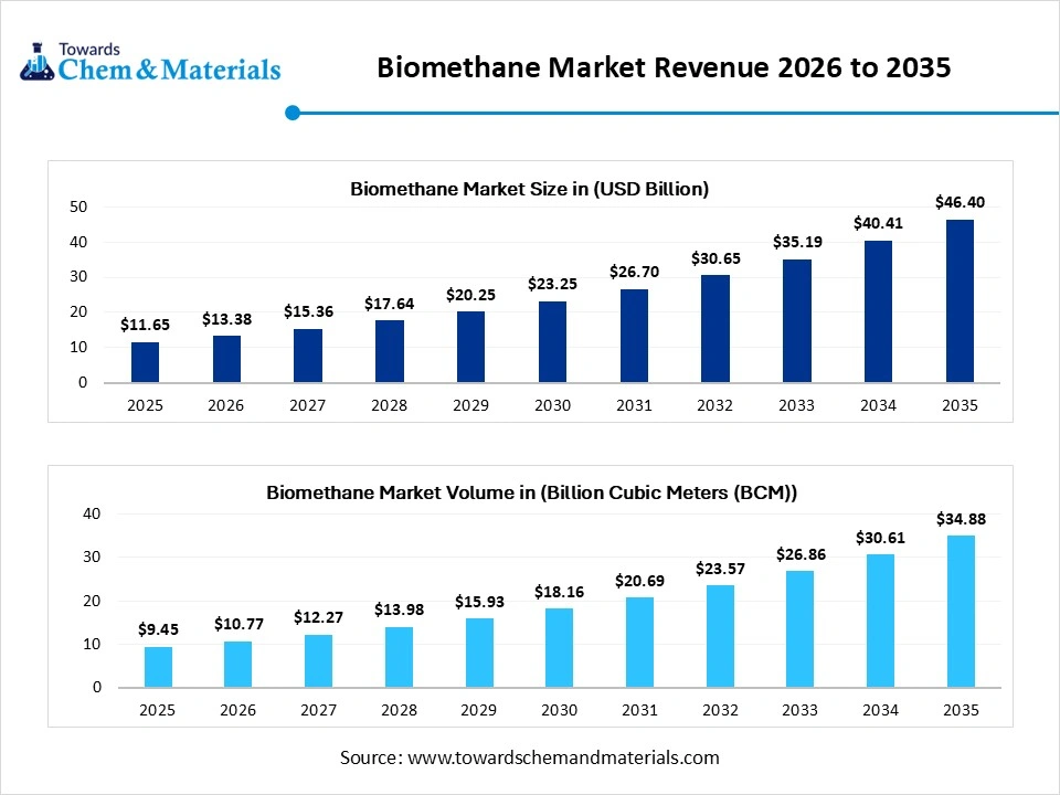 According to Towards Chemicals and Materials Analytics and Consulting, the global Biomethane market size was valued at USD 11.65 billion in 2025. The market is projected to grow from USD 13.38 billion in 2026 to USD 46.40 billion by 2035 at a CAGR of 14.82% during the forecast period 2026-2035