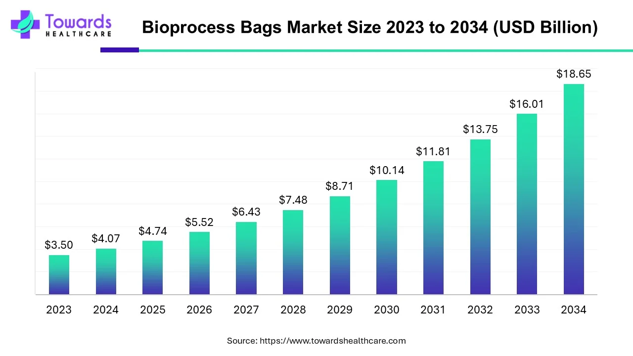 According to Towards Healthcare research, the global bioprocess bags market size is calculated at USD 4.74 billion in 2025 and is expected to reach around USD 18.65 billion by 2034, growing at a CAGR of 16.44% for the forecasted period.
