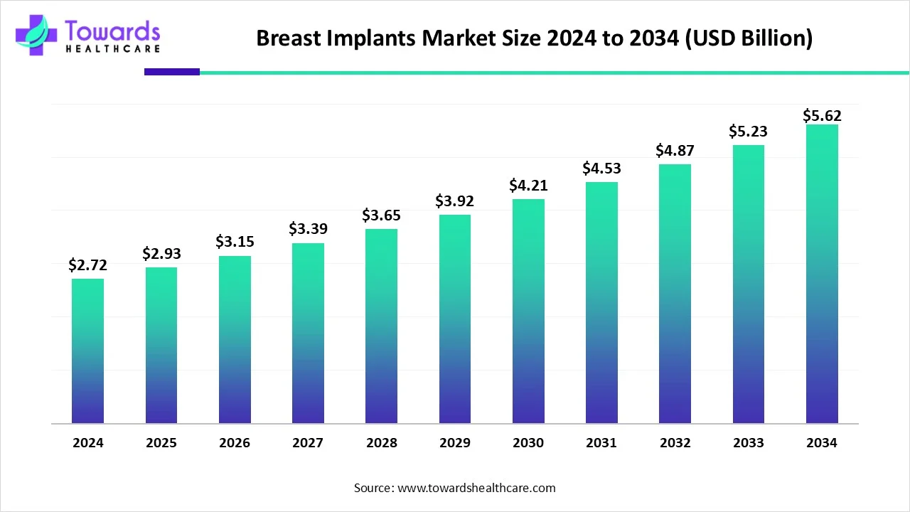 The global breast implants market size is calculated at USD 2.93 billion in 2025 and is expected to reach around USD 5.62 billion by 2034, growing at a CAGR of 7.54% for the forecasted period.