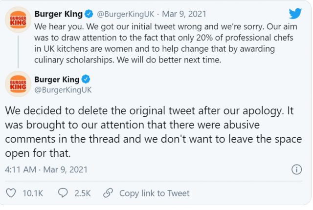 On March 8, which is International Women’s Day, Burger King UK tweeted, “Women belong in the Kitchen”.