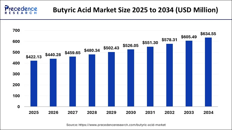 According to Precedence Research, the global butyric acid market size is expected to be worth over USD 634.55 million by 2034, up from USD 422.13 million in 2025. The market is growing at a CAGR of 4.60% from 2025 to 2034. The industry growth driven by increasing demand across industries such as animal feed, pharmaceuticals, food & beverages, and chemicals.