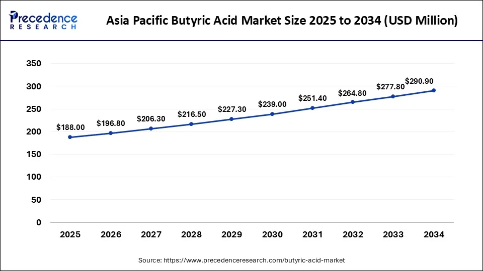 According to Precedence Research, the Asia Pacific butyric acid market size was estimated at USD 179.7 million in 2024 and is projected to be worth around USD 290.9 million by 2034, growing at a CAGR of 5% from 2025 to 2034.