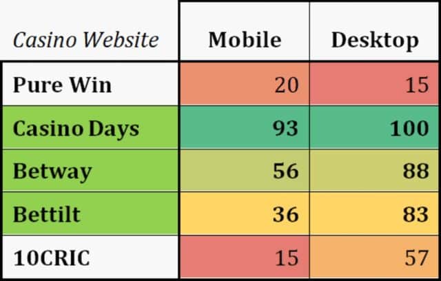 Out of the five participating online casinos, Casino Days registered an overwhelmingly best performance in both desktop and mobile media on PSI, a tool that assesses a website’s quality and efficiency and turns performance metrics into a score between 1 and 100.