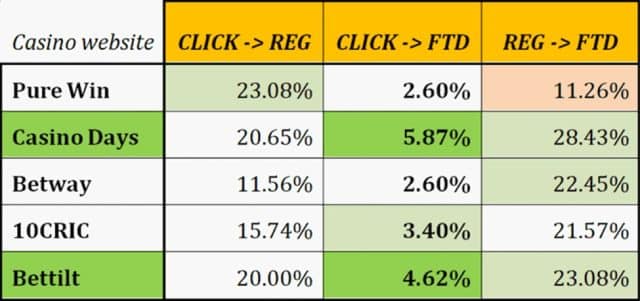 Looking at dedicated casino traffic, Casino Days displays superior performance getting a deposit from 5.87% of the clicks and from 28.43% of the registrations, even though the platform has only the second best click-to-reg ratio.