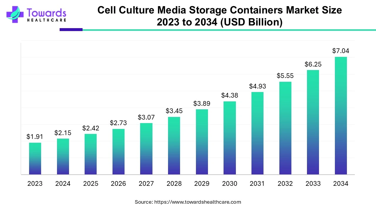 The global cell culture media storage containers market size is calculated at USD 2.42 billion in 2025 and is expected to reach around USD 7.04 billion by 2034, growing at a CAGR of 12.59% for the forecasted period.