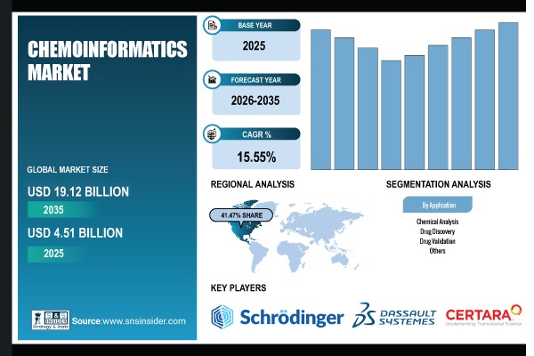 Austin, April 02, 2026 (GLOBE NEWSWIRE) — According to SNS Insider, The Chemoinformatics Market size was valued at USD 4.51 billion in 2025 and is expected to reach USD 19.12 billion by 2035, growing at a CAGR of 15.55% over 2026-2035.