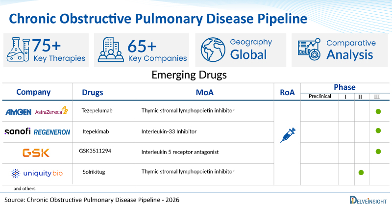 - Key Chronic Obstructive Pulmonary Disease Pipeline Therapies: Tezepelumab, Itepekimab, GSK3511294, Solrikitug, AZD6793, BBT002, GSK3862995, SPL5AC, EXPD-101, AERO-007, REGEND007, 9MW1911, JKN2403, HL231, Verekitug, CM326, PF-07275315, TQC3721, GDC-6988, UMC119-06-05, PUR 1800, Hemay005, RSS0343, R-3750, and others.