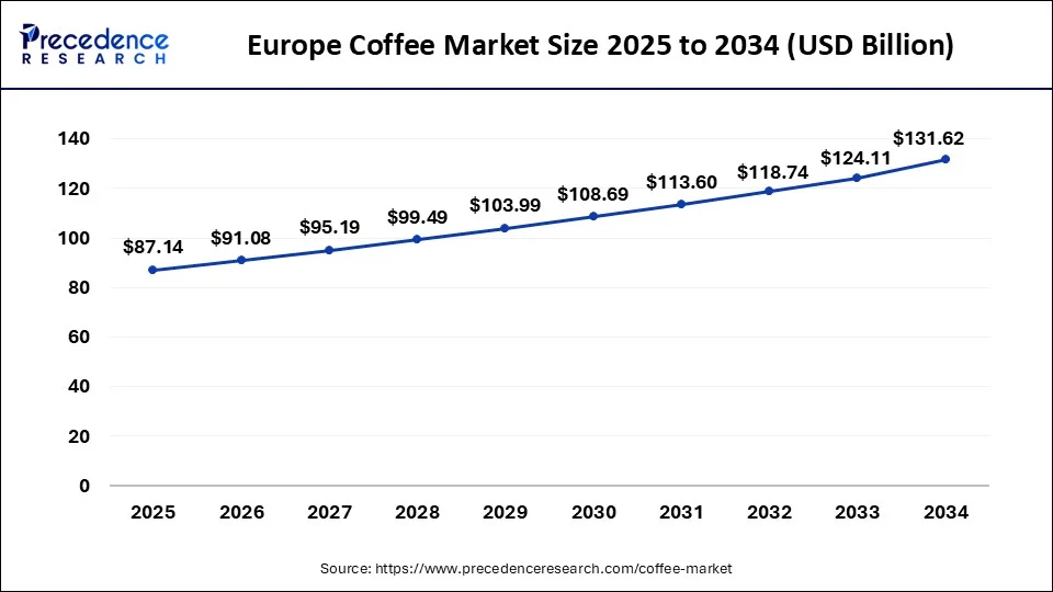 According to Precedence Research, the Europe coffee market size was valued at USD 245.2 billion in 2024 and is projected to reach USD 381.52 billion by 2034, growing at a CAGR of 4.52% from 2025 to 2034. The rising consumer demand for specialty and premium coffee in Europe, driven by a strong preference for high-quality brews and the growing popularity of specialty coffee shops, is a key driver of market growth in the region.