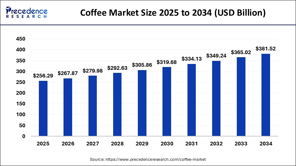 The global coffee market size is calculated at USD 256.29 billion in 2025 and is projected to be worth around USD 381.52 billion by 2034, with a CAGR of 4.52% between 2025 and 2034.