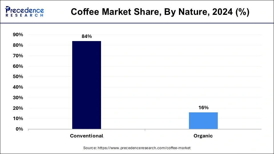 The conventional segment dominated the coffee market in 2024, owing to the heavy chemical treatments of conventional coffee among other foods in the world. The heavy treatments of conventional coffee with synthetic fertilizers, pesticides, fungicides, herbicides, and insecticides raise the utilization of this product.